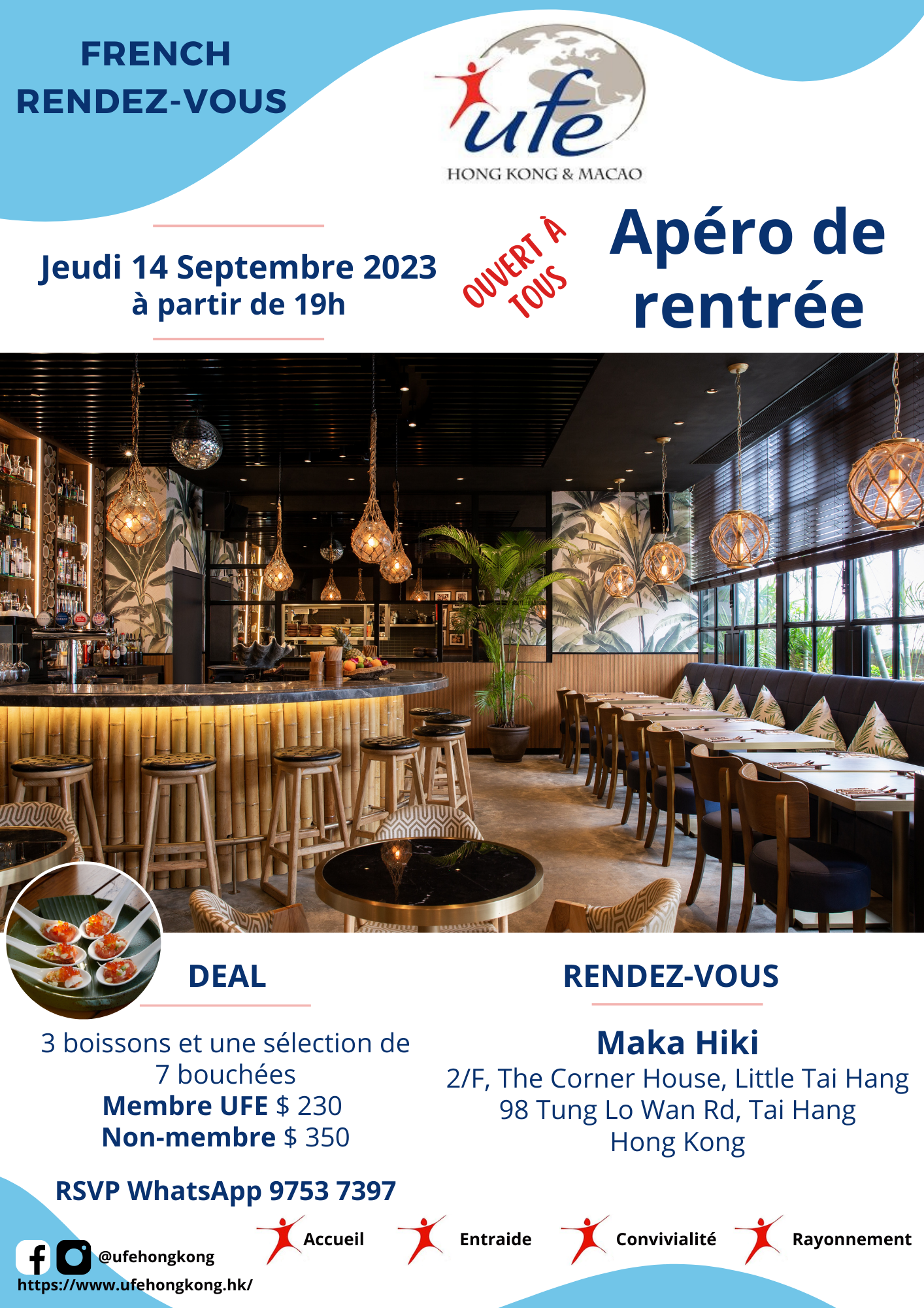 RDV au Maka Hiki jeudi 14 septembre à partir de 19h! Venez rencontrer la nouvelle équipe de l’UFE Hong Kong & Macao!